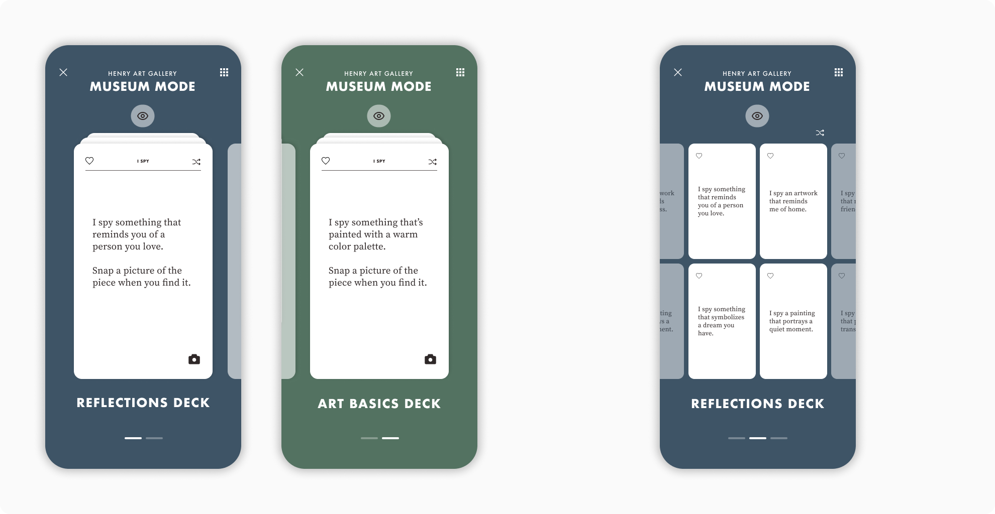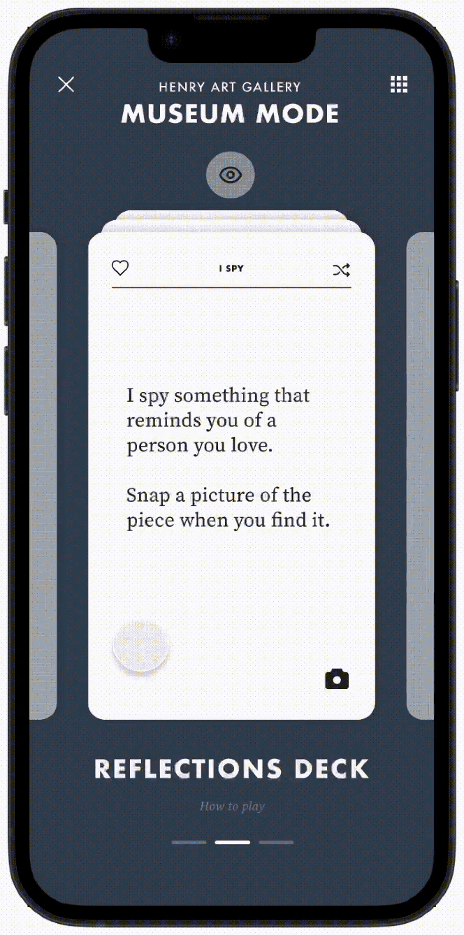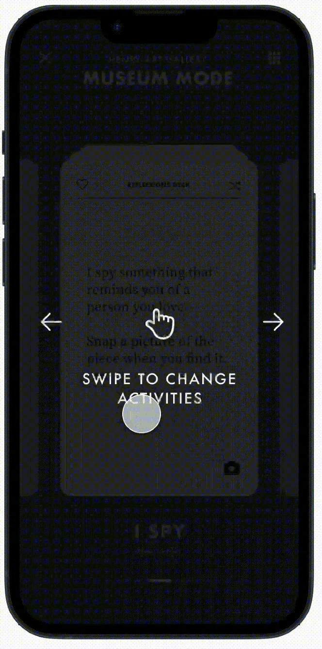 Upon entering the gallery, users can open I Spy to help them interact with the art. Each deck is full of cards prompting users to “spy” for works of art that feel connected to the prompt.