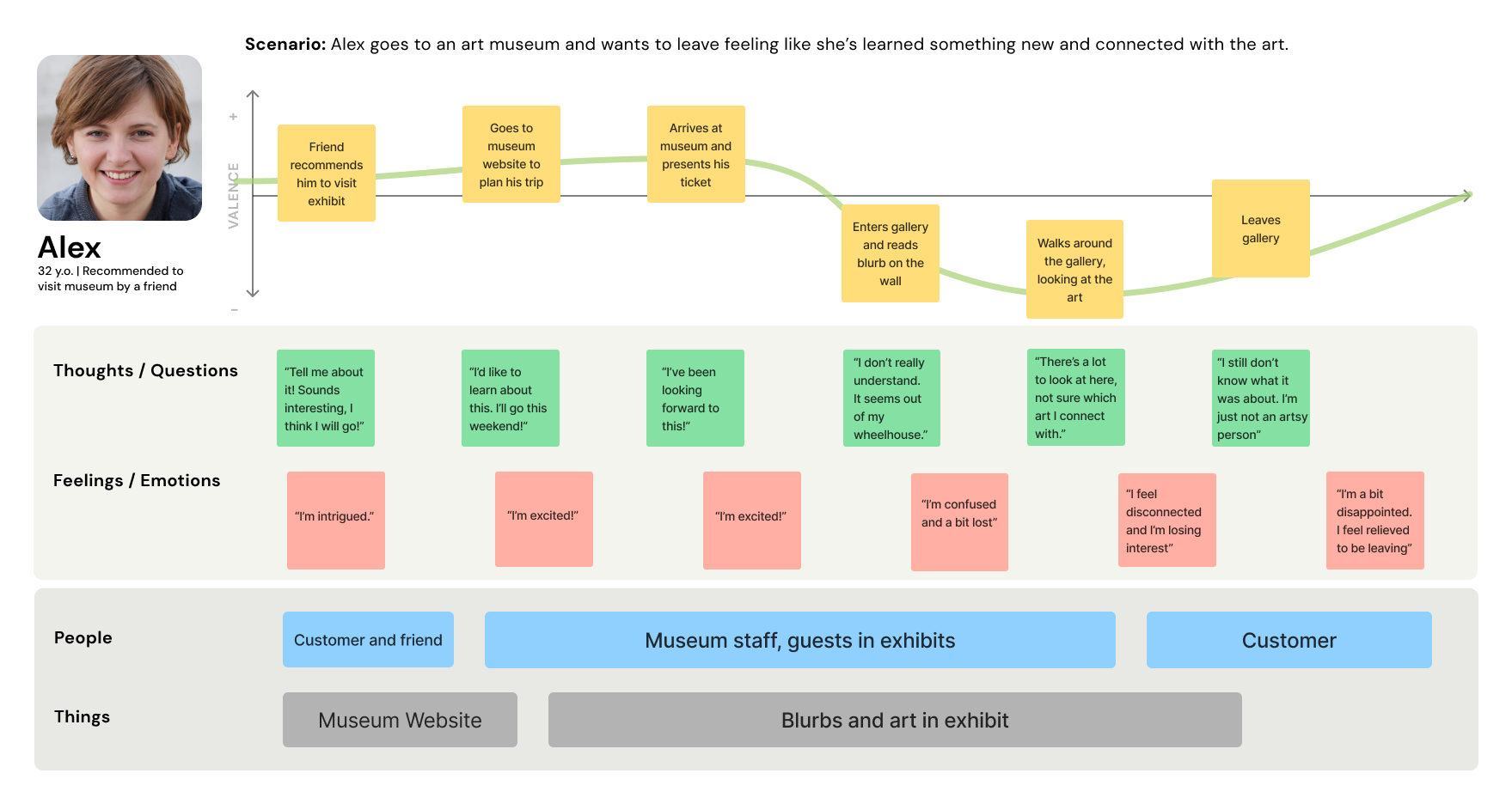We mapped a customer journey of Alex based on what we learned from our research. We wanted to focus on the issue of experiencing meaning, relevant to our top findings. I suggested that the most critical breakdown is when Alex is wandering the museum and trying to approach the art. Being unable to interpret the art could defeat the entire experience, and that a design solution could support a visitor entering the gallery.