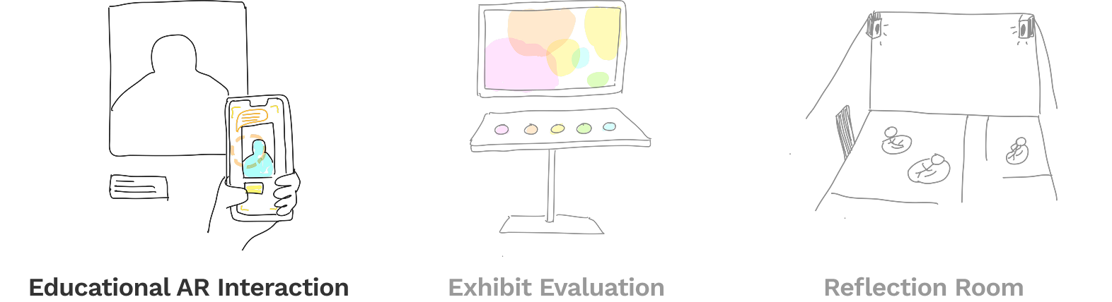 At each stage of downselection, we prioritized our persona’s needs and weighed the pros and cons of ideas in order to decide which ones to keep. The pros of all our final three ideas (educational AR interaction, exhibit evaluation, and reflection room) included the necessary support for personal interpretation and meaning-making. But we favored a mobile educational AR interface with details about artworks because of its flexibility of use throughout the entire gallery experience.