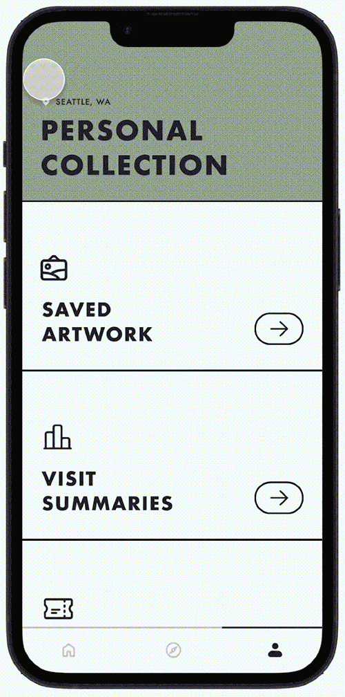 When finding an artwork related to a prompt, the user can then take a picture of it and record their reactions. The artwork gets saved to their personal collection.