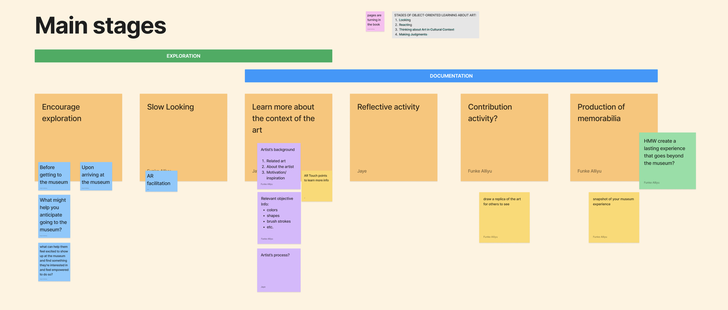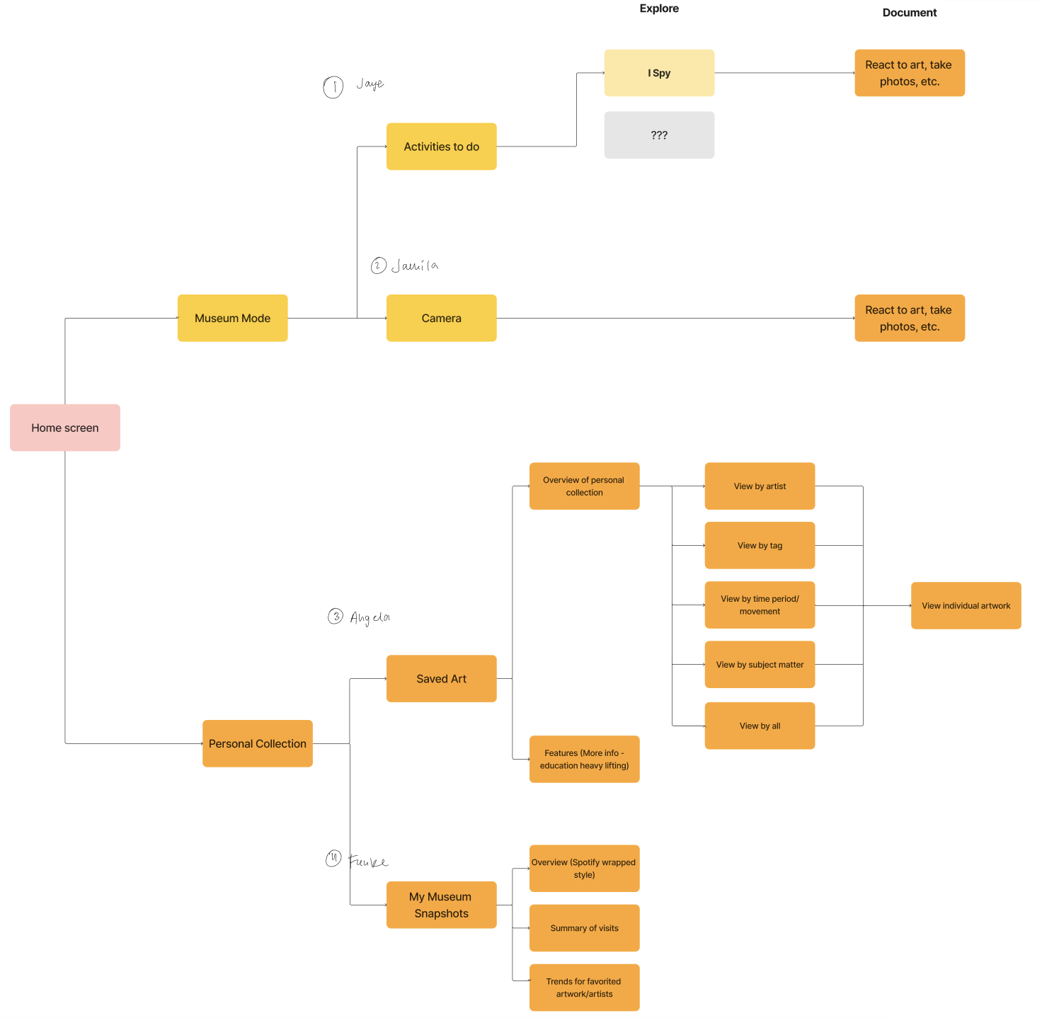 We found through competitive analysis that there are several art museum mobile apps that use AR to make art more interactive and educational. To differentiate our approach, we chose the theme of “exploration and documentation,” inspired by great thinkers such as Leonardo da Vinci and based on the stages of object-oriented art interpretation. Based on this theme, I created a framework of experience that my team and I collaborated on fleshing out. We built out the details even more by collaborating on a user flow.