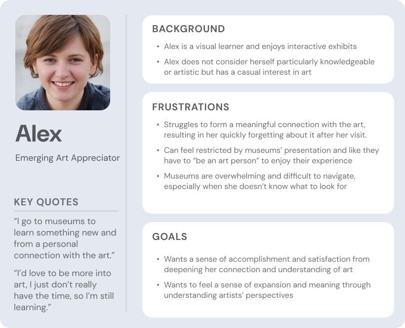 We encapsulated our top findings with a primary persona: Alex, the Emerging Art Appreciator